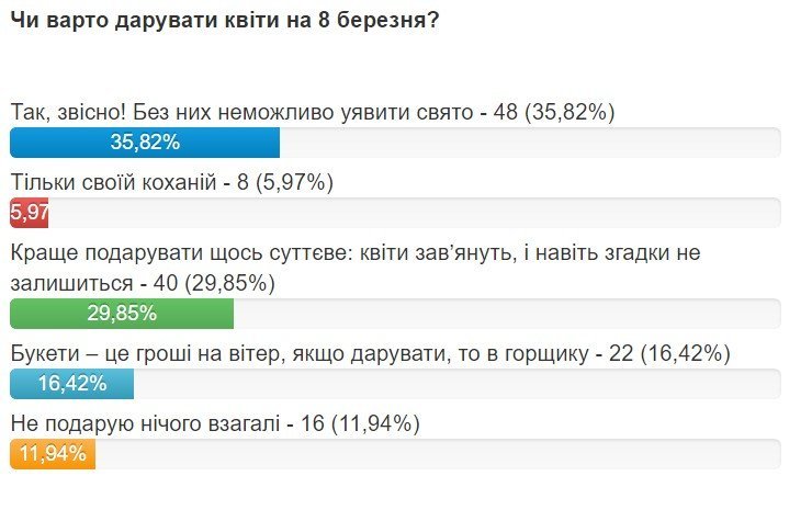Станом на 16.30, 35% опитаних читачів переконана, що 8 Березня ніяк не можна з’являтися на очі жінці без квітів, а 30% – що краще дарувати якісь сттєвіші і довговічніші подарунки. Ще 17% надали перевагу квітам у горщику, замість букетів.