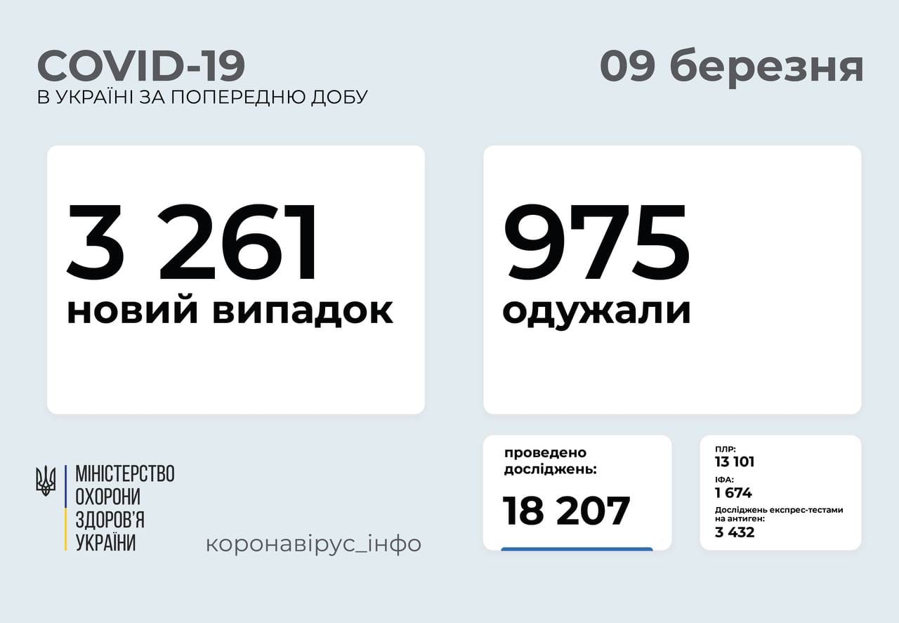 3 261 новий випадок коронавірусної хвороби COVID-19 зафіксовано в Україні станом на 9 березня, за повідомленням Міністерство охорони здоров’я України. Зокрема, захворіли 160 дітей та 54 медпрацівники.