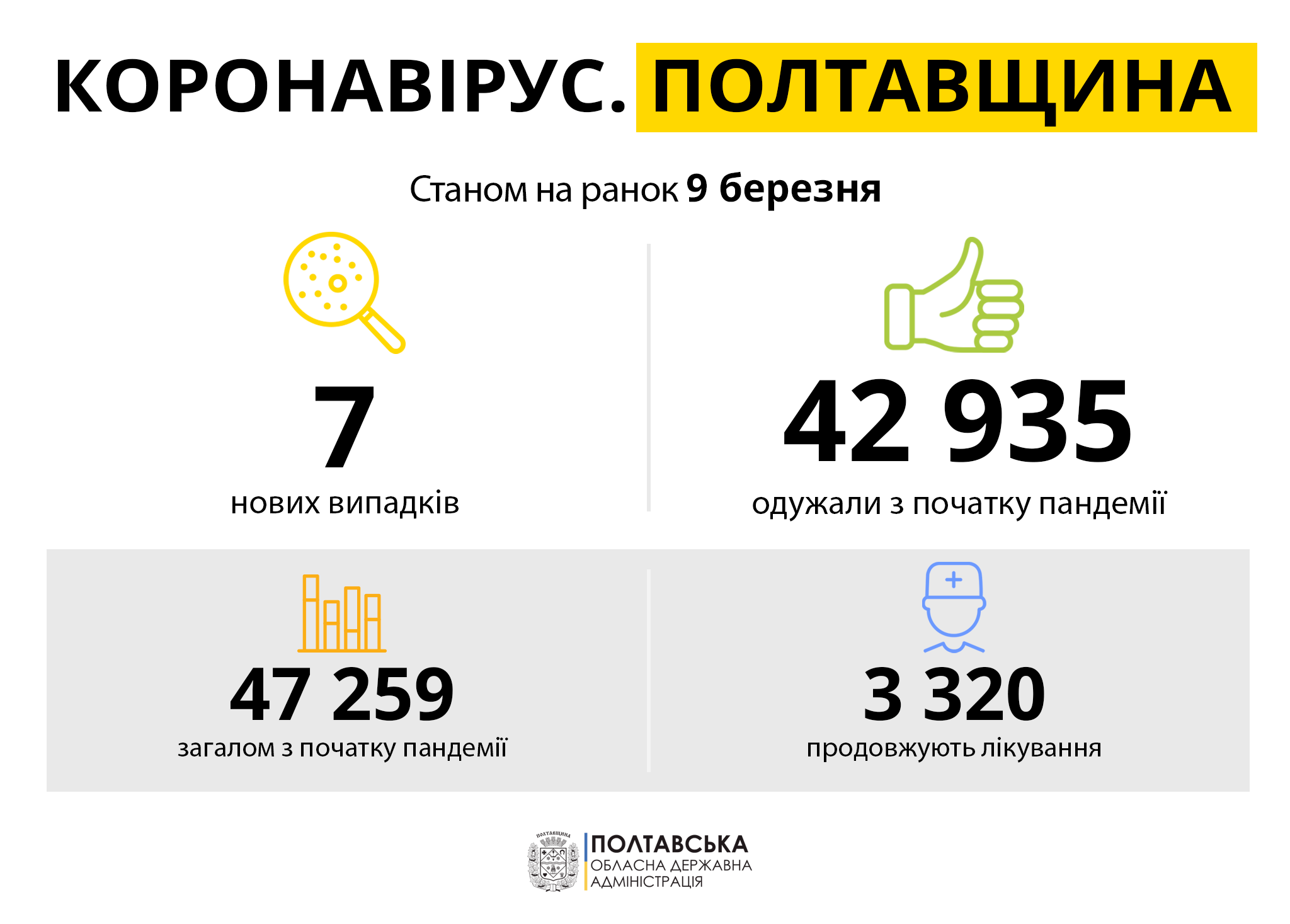 За інформацією Полтавського обласного лабораторного центру МОЗ України, від початку карантину на Полтавщині діагностували 47 259 випадків захворювання на COVID-19.