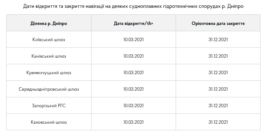 На всіх судноплавних шлюзах Дніпровського каскаду з середи, 10 березня, розпочався сезон навігації 2021 року. Про це йдеться в наказі Державної служби морського та річкового транспорту, оприлюдненому прес-службою відомства.
