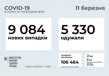 Станом на 11 березня в країні виявлено 9084 нових випадки коронавірусу, госпіталізовано 4250 людей, а одужало 5330. Як повідомив міністр охорони здоров’я України Максим Степанов.