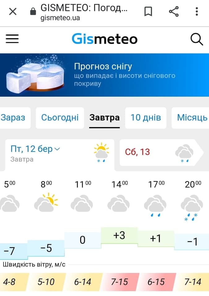 А Sinoptik прогнозує, що температура вдень становитиме близько 0°C, а вночі до -7°C.
