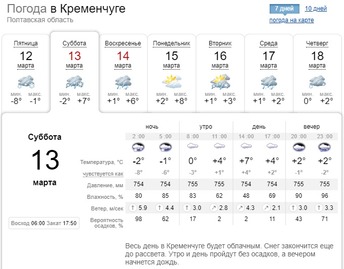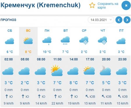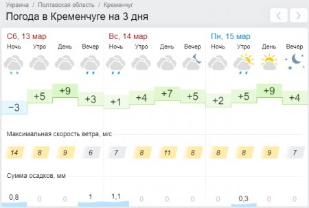 Gismeteo обещает, что в субботу, 13 марта, на смену морозному утру придёт достаточно тёплый день – до +9°С. И больше температура на уикенд не опустится ниже нуля. Зато в ночь с субботы на воскресенье в Кременчуге может дождить.