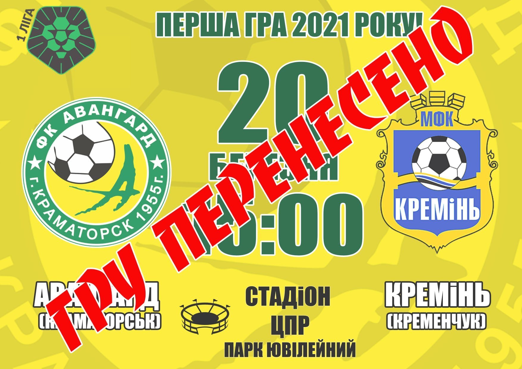 Перший весняний матч футбольного клубу «Кремінь» перенесли через спалах коронавірусу в команді краматорців. У зв’язку зі спалахом гострої респіраторної хвороби COVID-19 серед гравців, тренерів та персоналу футбольного клубу «Авангард» матч перенесли на пізніший термін.
