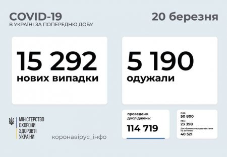 15 292 нових випадки коронавірусної хвороби COVID-19 зафіксовано в Україні станом на 20 березня 2021 року, повідомляє Міністерство охорони здоров'я України. Зокрема, захворіли 797 дітей та 367 медпрацівників.