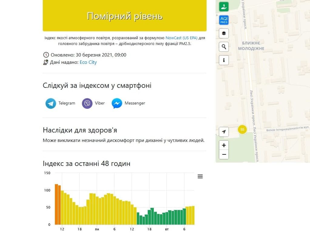 Слід зазначити, що в даному випадку повітря досліджується лише за одним показником – вмістом дрібнодисперсного пилу фракції РМ2.5. І хоча показник далеко не найгірший по країні, таке повітря може викликати певний дискомфорт при диханні у чутливих людей.