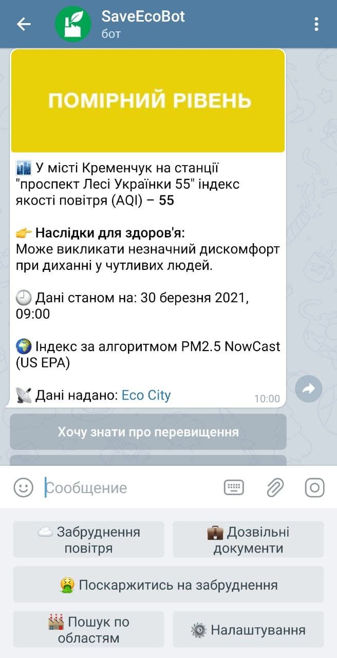 За допомогою бота кременчужани можуть не тільки дізнатися про рівень забруднення повітря, а й швидко подати скаргу у разі виникнення забруднення.