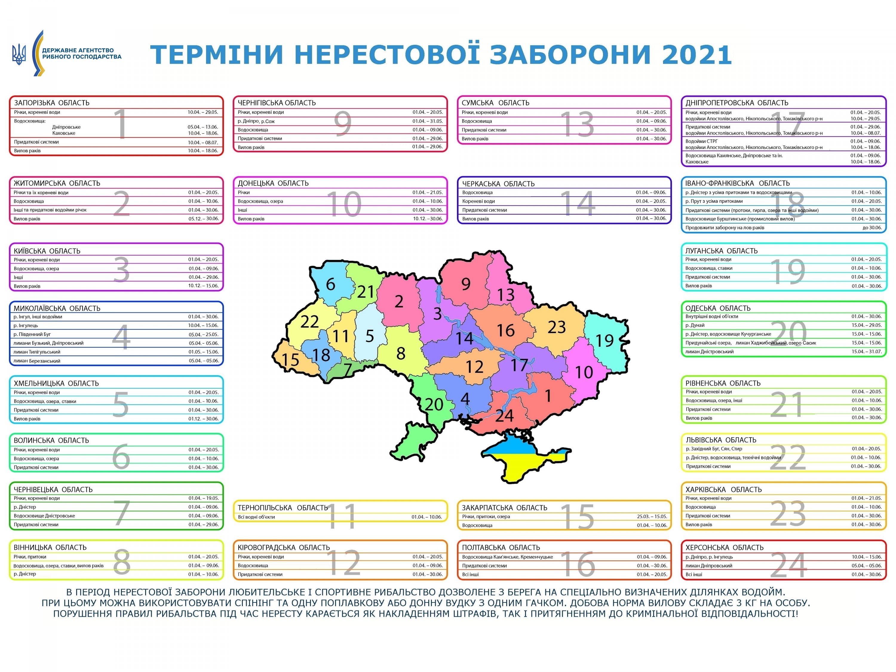 Тривалість нерестової заборони відрізняється залежно від областей та водойм – на Полтавщині вона триватиме до 9 червня. З детальною інформацією можна ознайомитися у наказах відповідних територіальних управлінь за посиланням.