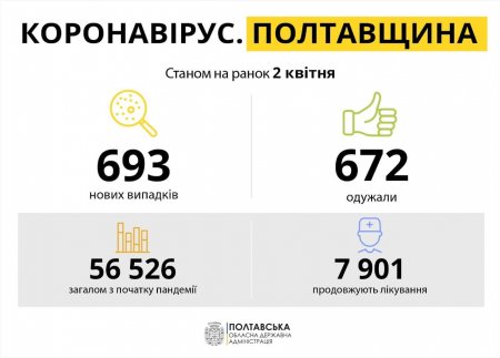 За інформацією Полтавського обласного лабораторного центру МОЗ України, від початку карантину на Полтавщині діагностували 56526 випадків захворювання на COVID-19, за минулу добу – 693.