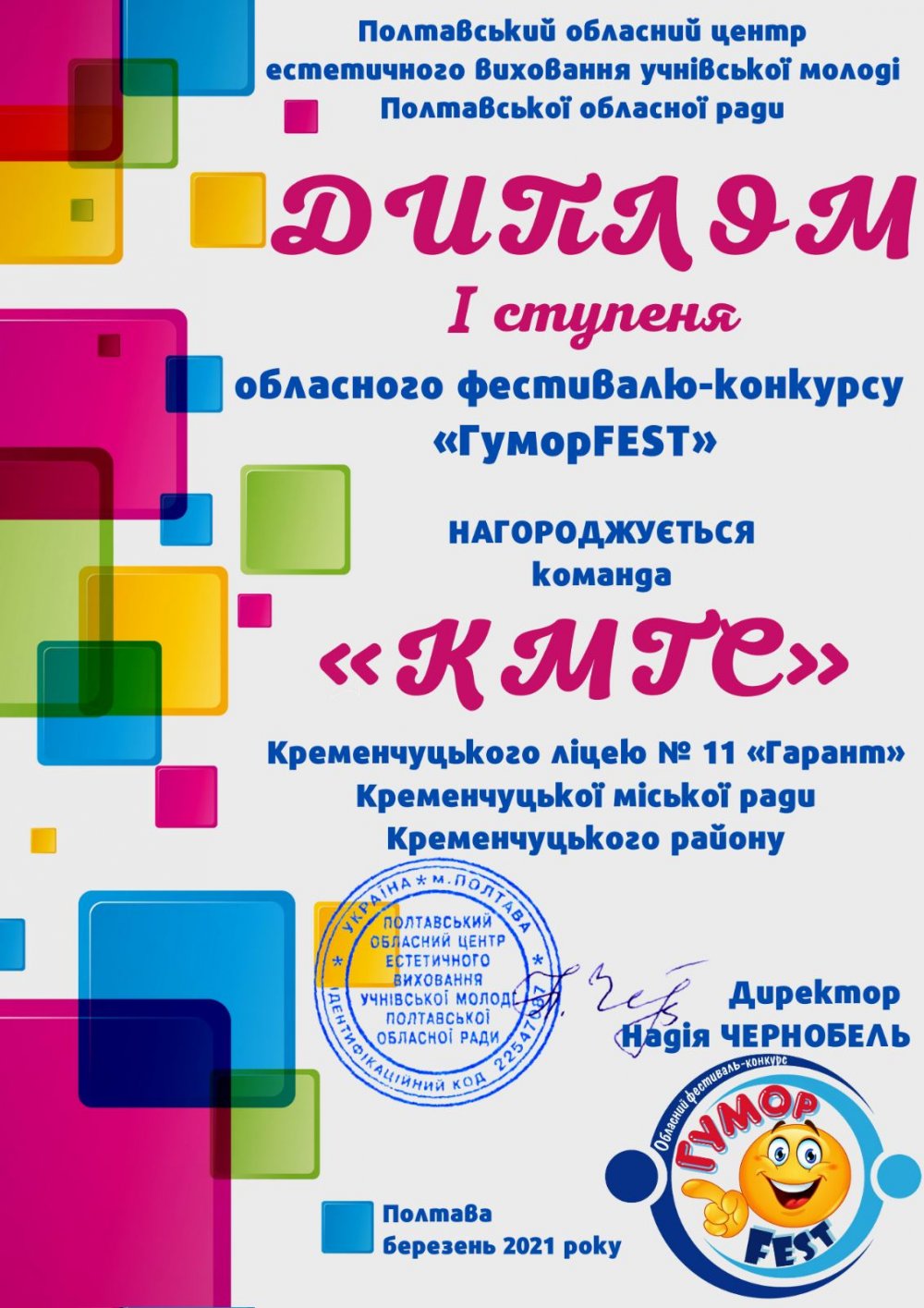 В обласному фестивалі-конкурсі «ГуморFEST» стали переможцями Кременчуцькі ліцей №11 «Гарант» та ліцей №5 ім. Т.Г. Шевченко. Про це повідомляє департамент освіти Кременчука.