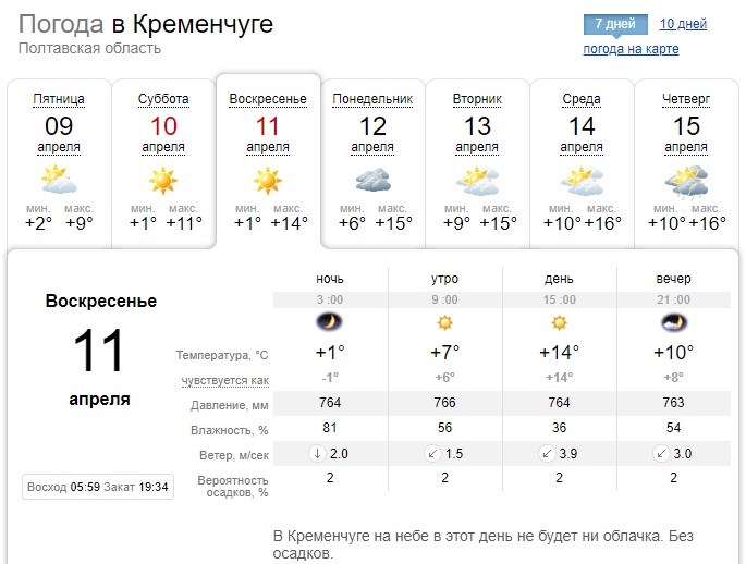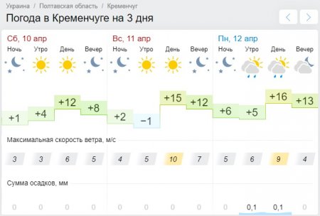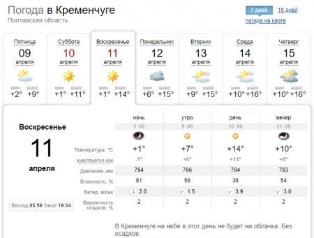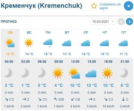 По прогнозам Ventusky, облака ненадолго заволокут небо над Кременчугом в обеденное время в субботу, 10 апреля, а в целом солнечная погода порадует кременчужан в ближайшие два дня. Температурный режим составит от 0°С до +14°С.