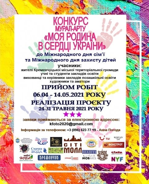 Відкрився прийом робіт на участь у конкурсі мурал-арту «Моя родина в серці України». За інформацією пресслужби мерії Кременчука, конкурс присвячений Міжнародному дню сім`ї та Міжнародному дню захисту дітей.