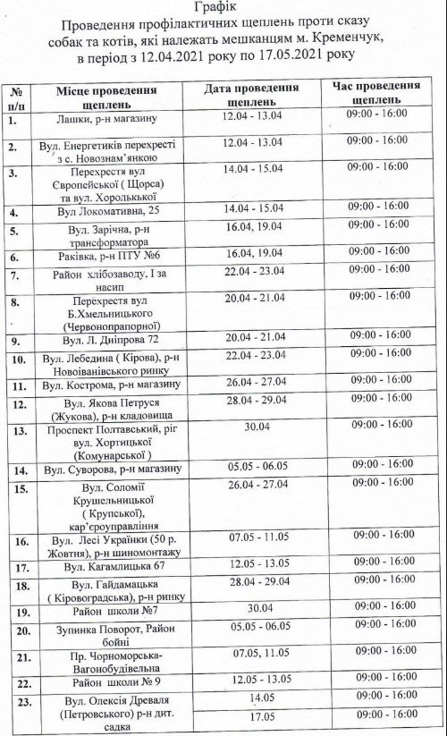 У Кременчуці з 12 квітня розпочинається вакцинація тварин від сказу. Як повідомляє Кременчуцька районна державна лікарня ветеринарної медицини, щеплення проводитимуть по районам, згідно з графіком. Завершать 17 травня.