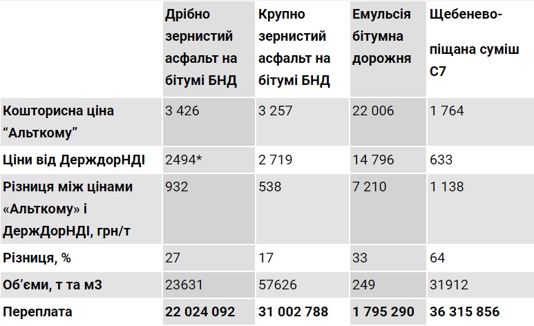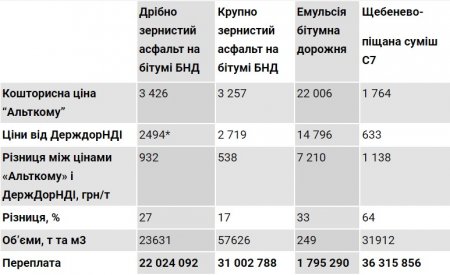 Також суттєві завищення цін зафіксовані на бітумну емульсію та щебенево-піщану суміш. По цим будматеріалами переплата становить близько 38 млн гривень.