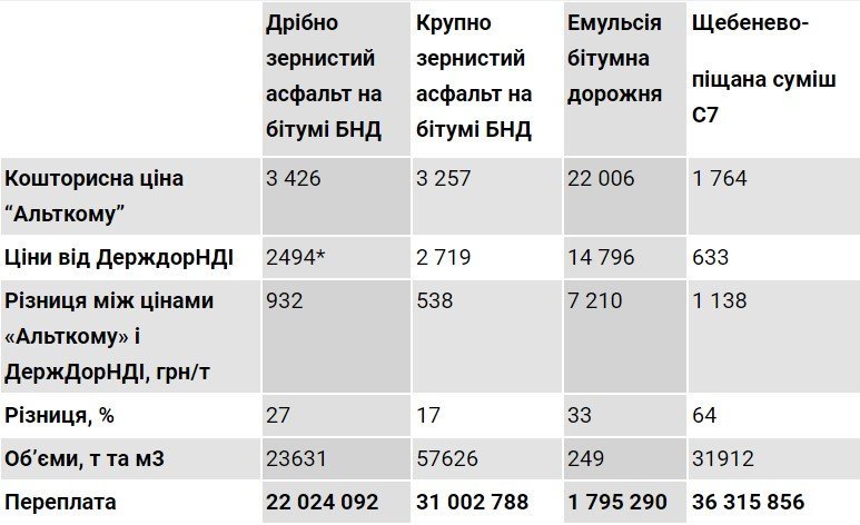 За даними «Наших грошей», у період виконання ремонтних робіт в серпні-жовтні «Альтком» закуповував будматеріали у своїх постачальників дешевше. В середньому дрібнозернистий та крупнозернистий асфальт закуповувались за 2 500 – 3 000 тис грн/т. Середня ціна бітумної дорожної емульсії складала 12 000 грн/т, а максимальна ціна за щебенево-піщану суміш була 342 грн/м3, тобто на 80% дешевше тендерної ціни.
