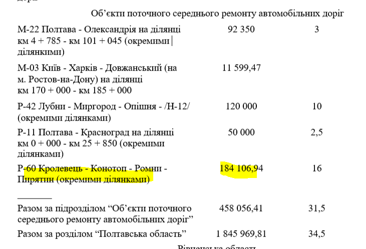 Йдеться про середній ремонт Р-60 Кролевець-Конотоп-Ромни-Пирятин (окремими ділянками). У липні 2020 року за результатами тендеру компанія «Альтком» отримала підряд вартістю 455,07 млн грн. З цієї суми 184,11 млн грн було виділено з Фонду боротьби з COVID-19.