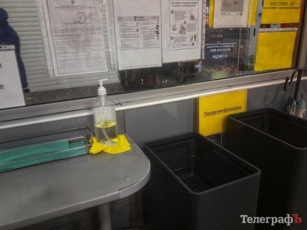 Те, що є в більшості українських супермаркетів, у Кременчуці не спостерігається, а саме відсутні захисні скляні бар’єри на касах, повз які щодня проходить сотні клієнтів. Максимум, що можна побачити – касир у масці, а в окремих випадках й захисну медичну екран-маску. На вході зазвичай стоїть спеціальний засіб для дезінфекції, одноразові рукавички і вже продезинфіковані кошики.