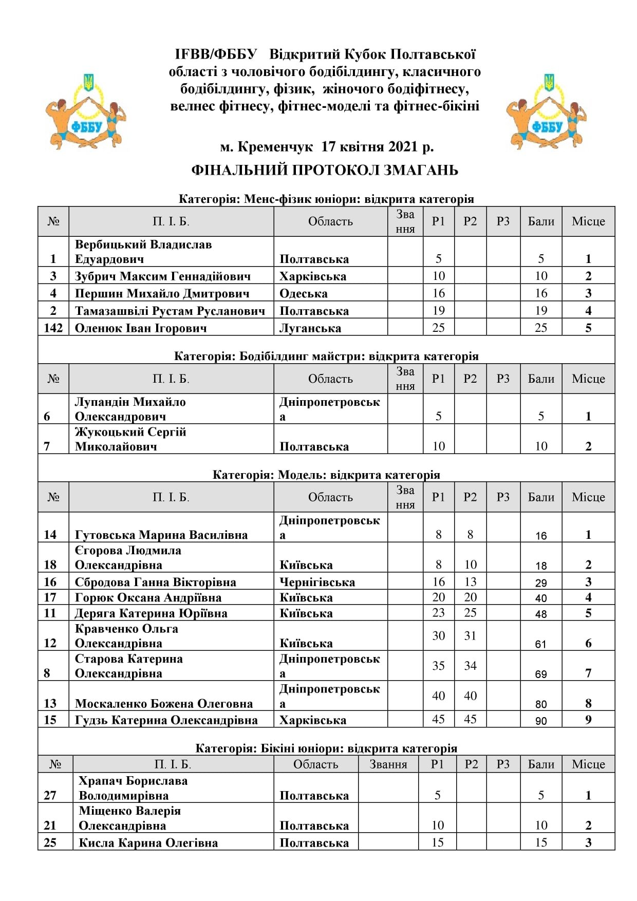 У Кременчуці, 17 квітня відбувся Відкритий Кубок Полтавської області з бодібілдингу «ENERGY CUP»-2021. Участь у змаганнях взяли спортсмени не лише з Полтавської, а й Київської, Харківської, Донецької, Дніпропетровської, Закарпатської та Сумської областей.