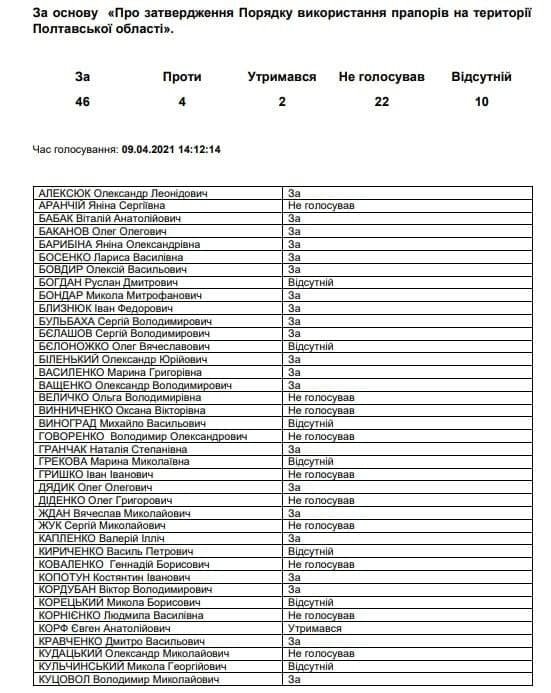 На засіданні сесії облради, 9 квітня, депутати затвердили порядок використання прапорів на території Полтавської області. За рішення з другої спроби проголосували 48 депутатів.
