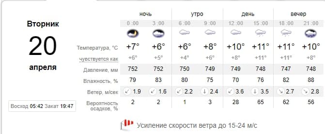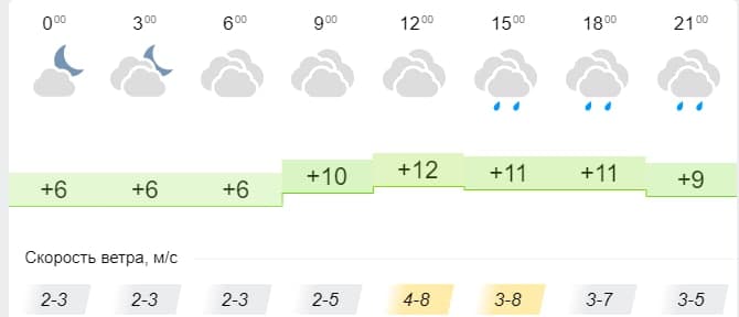 Прогнози сайтів метеорологічних служб збігаються з офіціальним звітом. Так, за даними і Sinoptik, і Gismeteo, і Ventusky очікується похмура погода з дощем, сильними поривами вітру та температурою від +6 до +12°C.