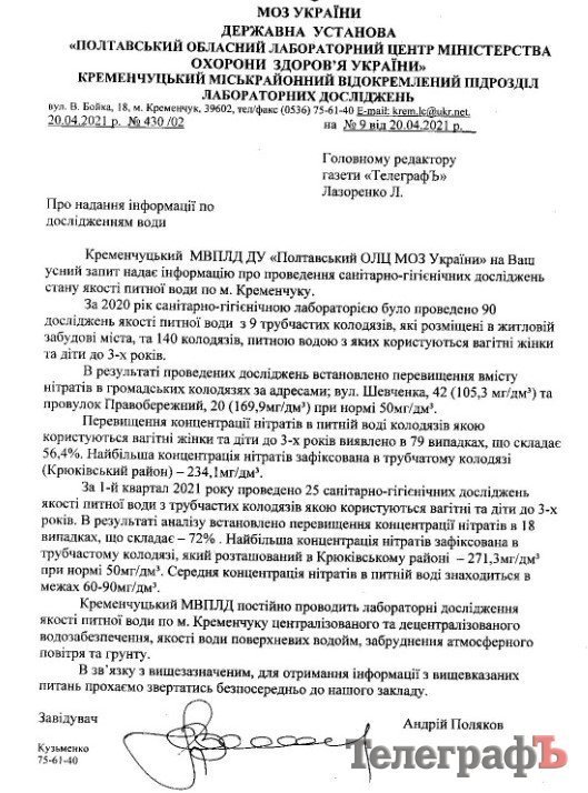 За інформацією щодо конкретних адрес колодязів з підвищеним вмістом нітратів «Телеграф» звернувся до Кременчуцького міськрайонного відокремленого підрозділу лабораторних досліджень Державної установи «Полтавський ОЛЦ МОЗ України».