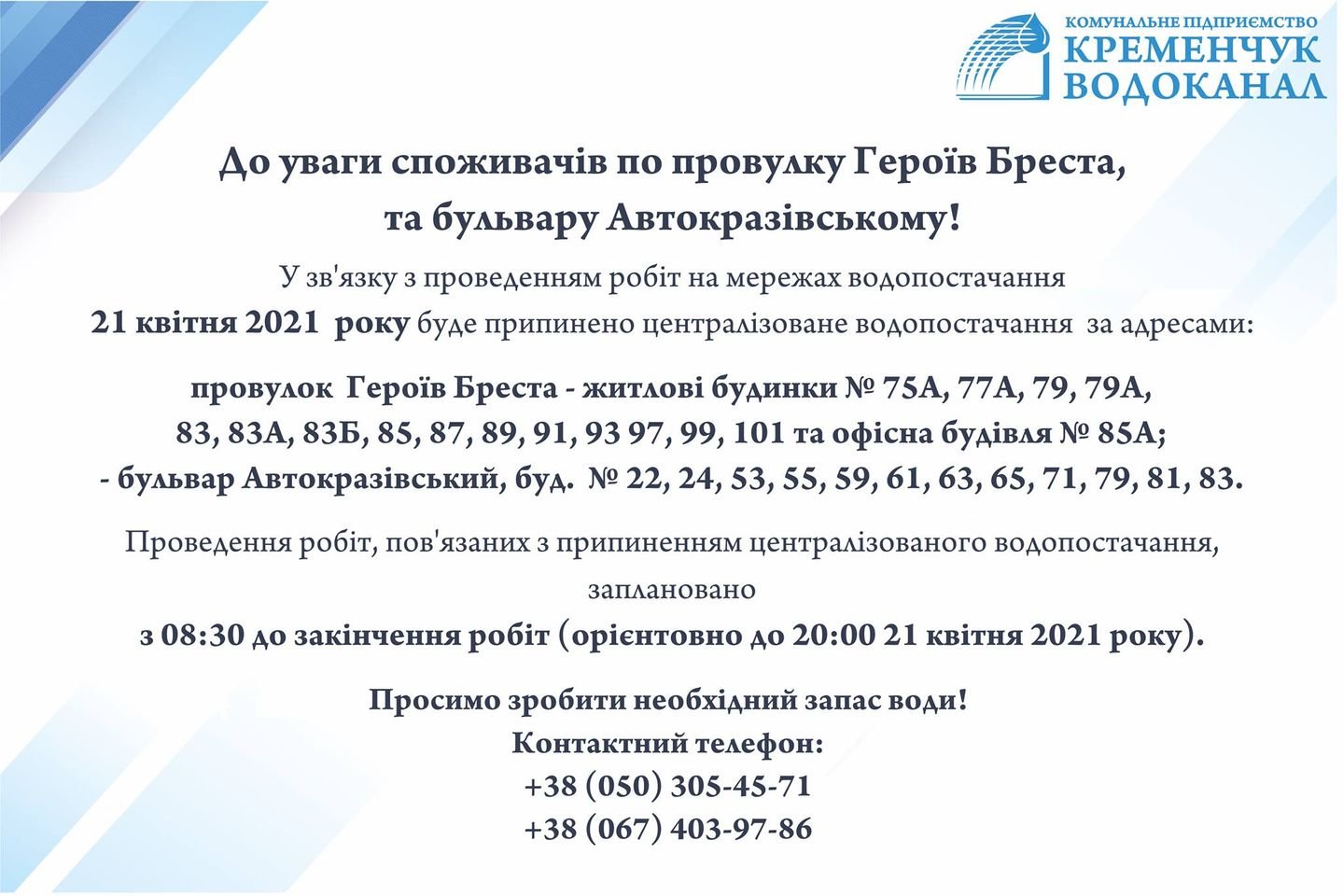 У зв’язку з цим з 8.30 до 20.00 (орієнтовно) буде припинено централізоване водопостачання за адресами: