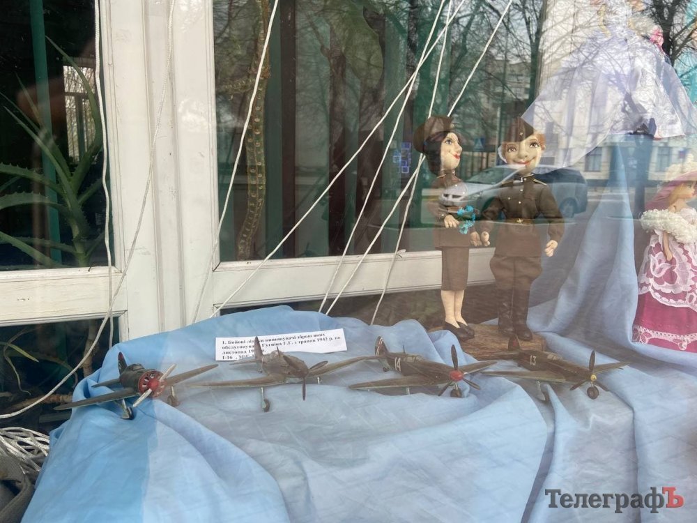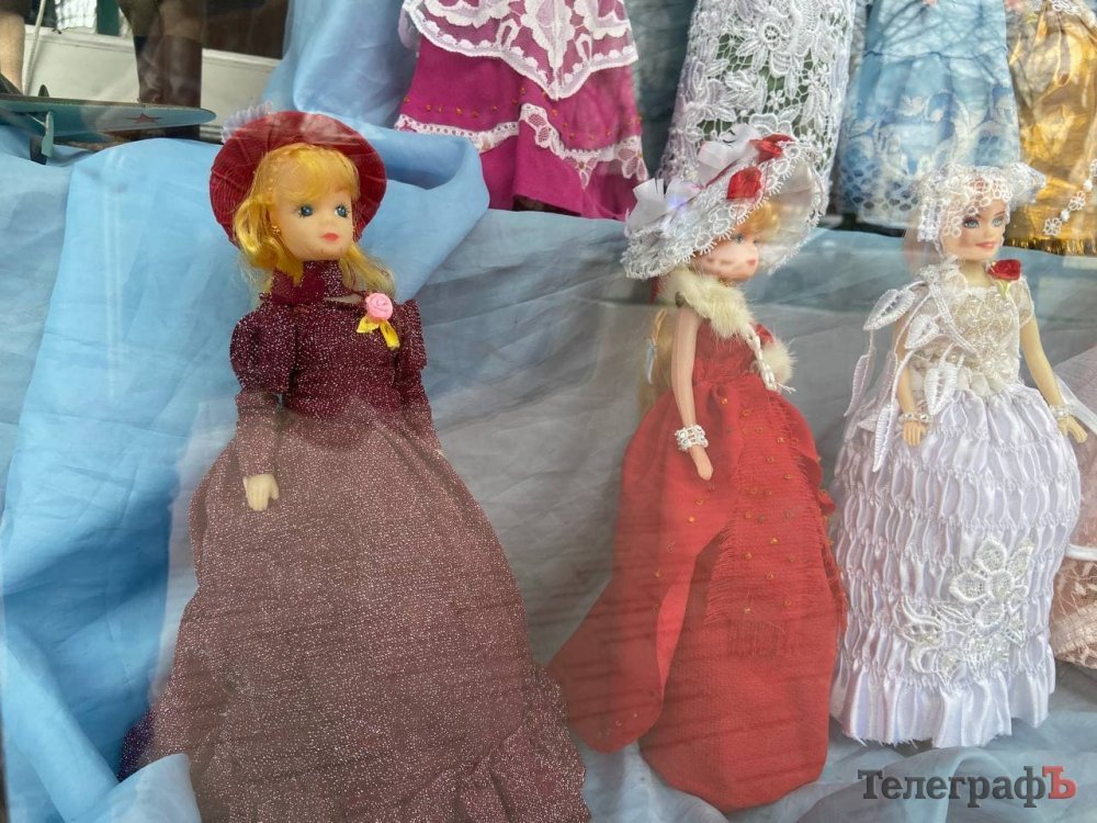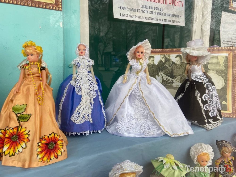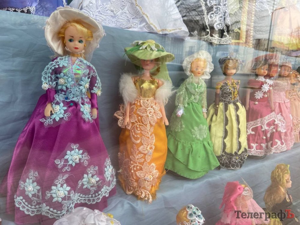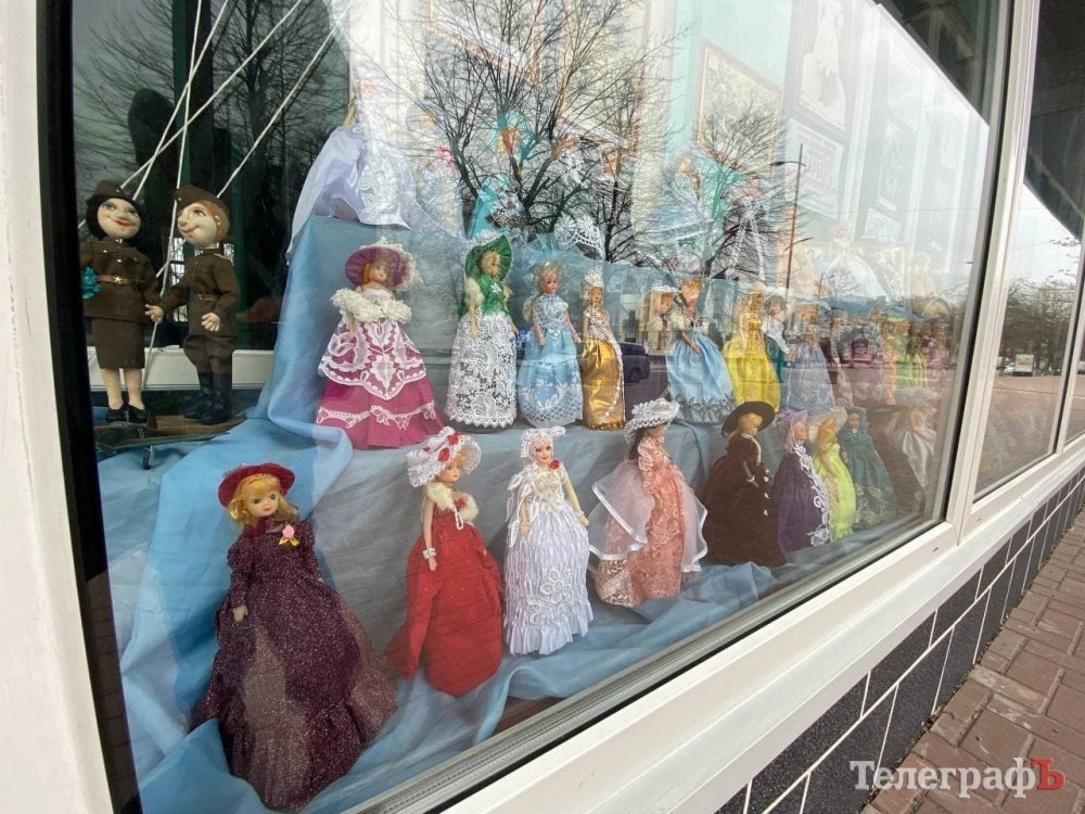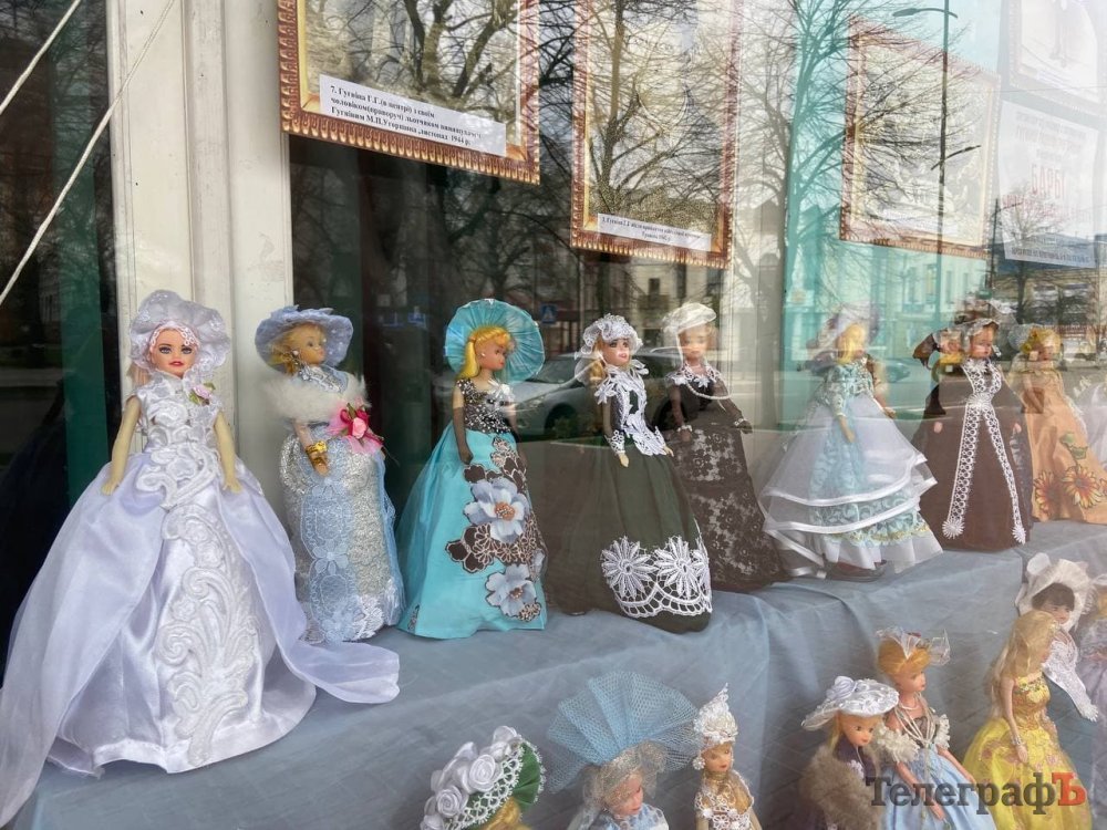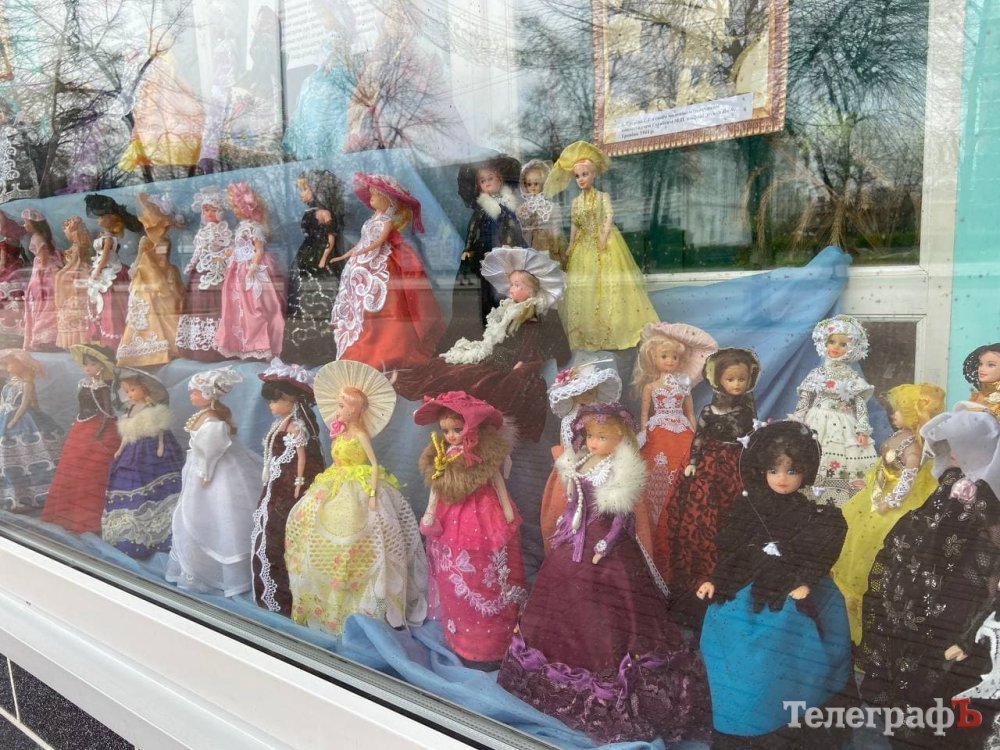 У вітрині Центральної міської дитячої бібліотеки демонструється виставка ляльок Барбі в ексклюзивних вбраннях, які пошила ветеран Другої світової війни та дружина Героя Радянського союзу Галина Григорівна Гугніна*.