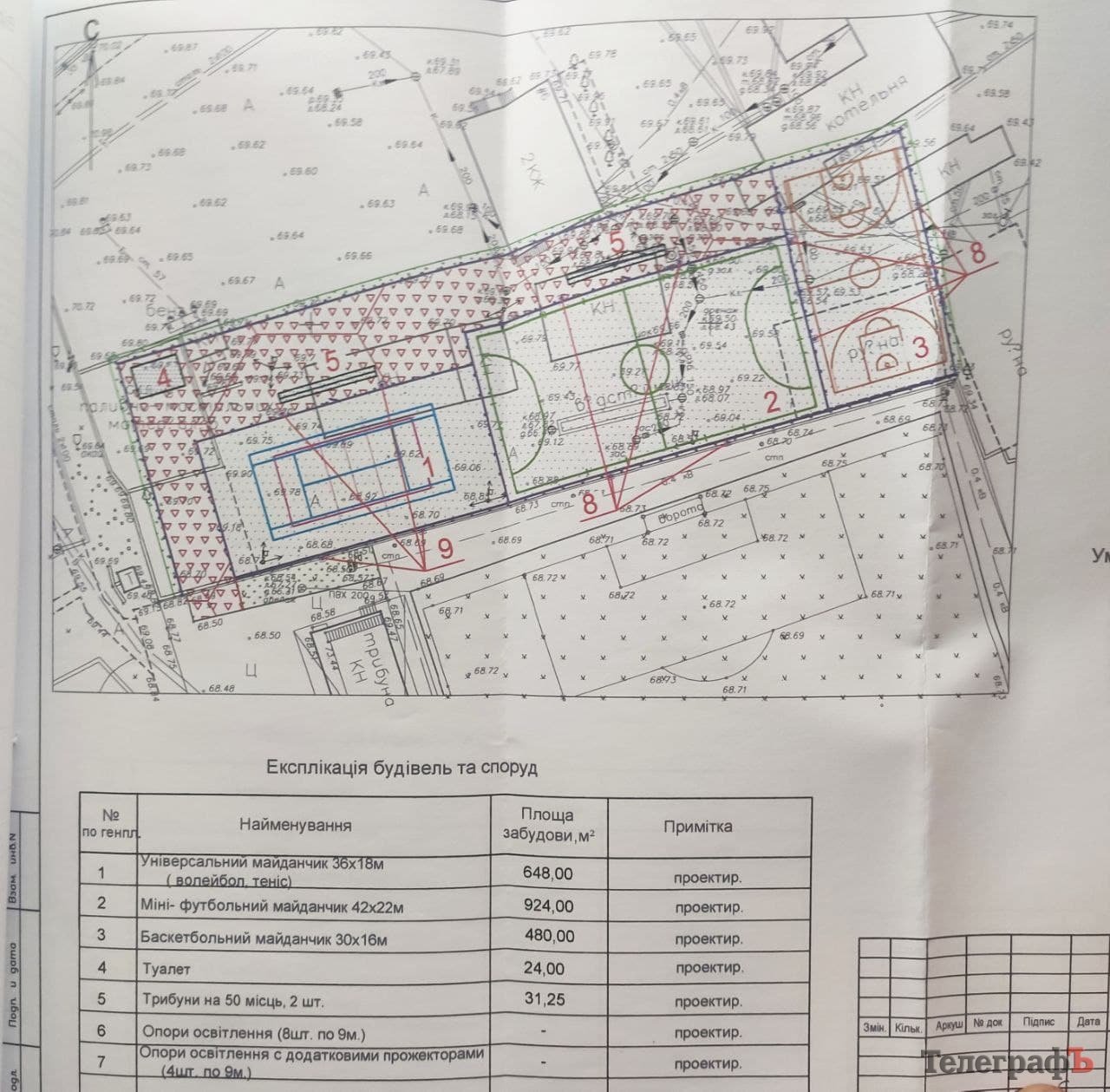 Згідно з проєктом передбачене будівництво: майданчика теніс+волейбол 36х18м, міні-футбольного поля 42х22м, баскетбольного майданчика 30х16м, двох невеликих трибун на 50 місць і туалет.