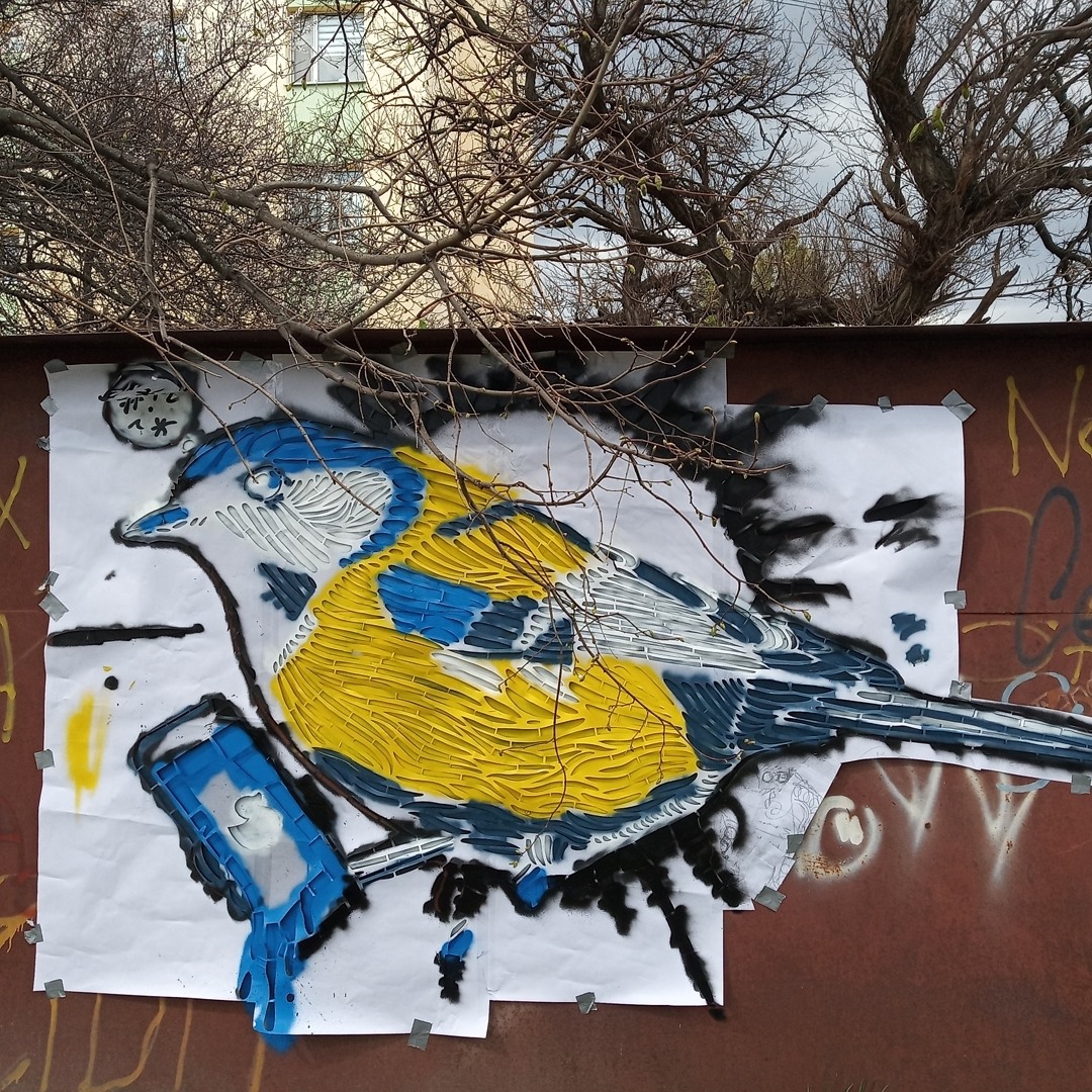 На Раківці з'явилася синиця, яка тримає у лапці смартфон. Арт-об'єкт створив художник Сергій Брильов. Світлинами зображеного птаха він поділився на своїй сторінці у фейсбуці.