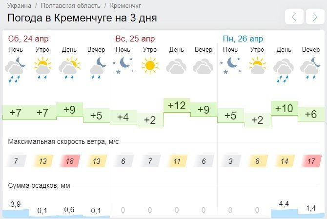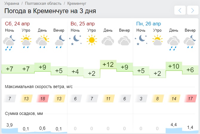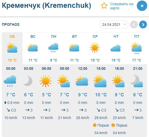 Ventusky не сообщает об осадках в субботу и воскресенье. Но предупреждает о порывах ветра до 54 км/час во второй половине дня в субботу, 24 апреля. В Кременчуге продержится переменная облачность. Воздух прогреется до показаний от +2°С до +11°С.