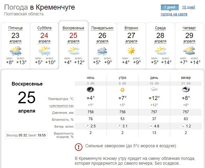 Sinoptik заявляет, что уикенд будет «морозить» кременчужан. Погодный портал обещает в субботу, 24 апреля, до -1°С в воздухе, а в воскресенье, 25 апреля, – до -5°С. Дневная температура поднимется до +10-12°С, не больше. Сильный дождь пройдёт в ночь с субботы на воскресенье.