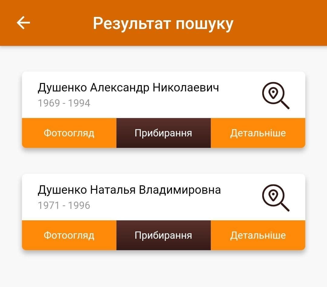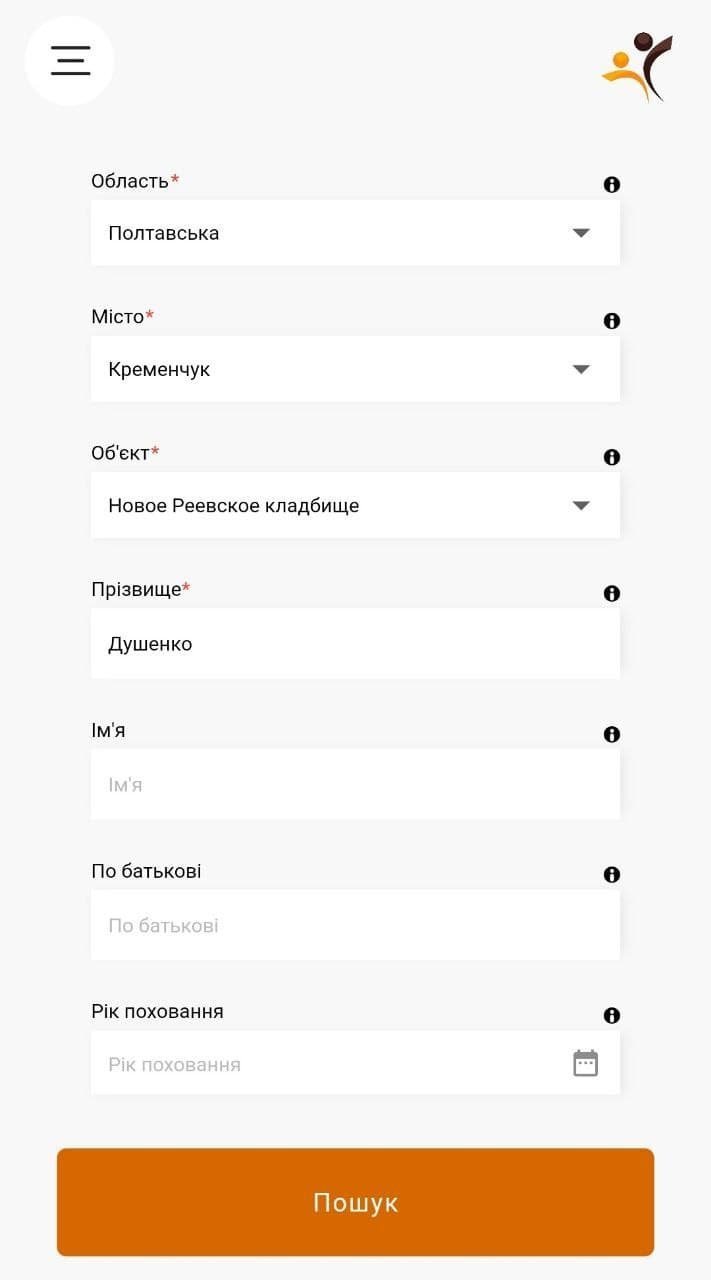 Далі оберіть область, місто та цвинтар. Введіть кілька літер прізвища вашої близької людини та натисніть пошук.