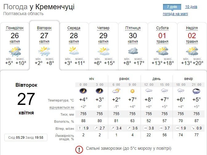 Вночі з 27 квітня на 28 квітня та вранці 28 квітня в Полтавській області, зокрема, у Кременчуці, очікуються сильні заморозки: 0…-3°С у повітрі. Як повідомляє Полтавський обласний центр з гідрометеорології, регіон отримав штормове попередження.