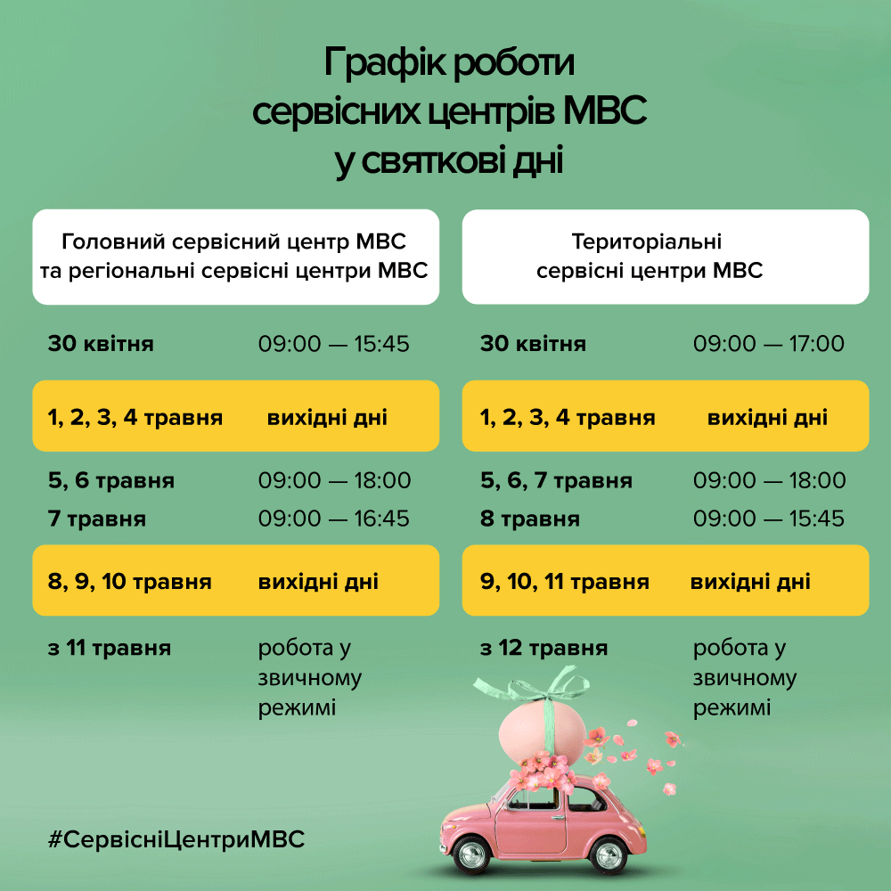 Для Головного центру та регіонального сервісного центру МВС в Полтавській області ГСЦ МВС вихідними будуть дні з 1 по 4 травня та з 8 по 10 травня (включно).