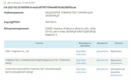 За результатами етапу прекваліфікації, який завершений 27 квітня, ПАТ «Укрзалізниця» мусить скасувати тендер на 100 пасажирських вагонів. Адже лише один учасник — Крюківський вагонзавод — пройшов етап прекваліфікації. Пропозиції інших учасників (по всіх чотирьох лотах) відхилені. Інформація про це розміщена на порталі публічних закупівель Prozorro. Оскільки з одним учасником аукціон відбутися не може, за законом «Про публічні закупівлі», замовник - «Укрзалізниця» - мусить скасувати тендер. І потім оголосити його заново.