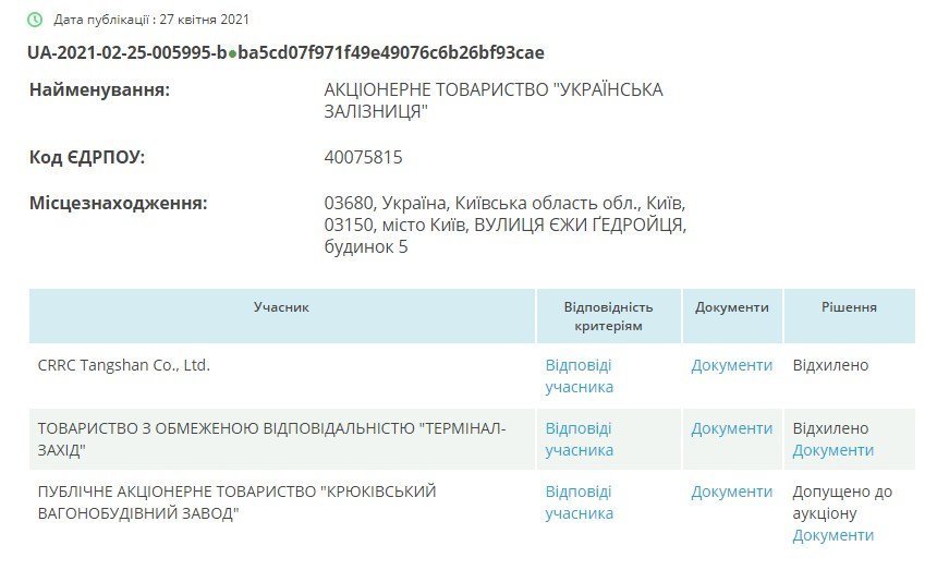 За результатами етапу прекваліфікації, який завершений 27 квітня, ПАТ «Укрзалізниця» мусить скасувати тендер на 100 пасажирських вагонів. Адже лише один учасник — Крюківський вагонзавод — пройшов етап прекваліфікації. Пропозиції інших учасників (по всіх чотирьох лотах) відхилені. Інформація про це розміщена на порталі публічних закупівель Prozorro. Оскільки з одним учасником аукціон відбутися не може, за законом «Про публічні закупівлі», замовник – «Укрзалізниця» – мусить скасувати тендер. І потім оголосити його заново.