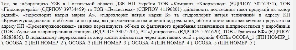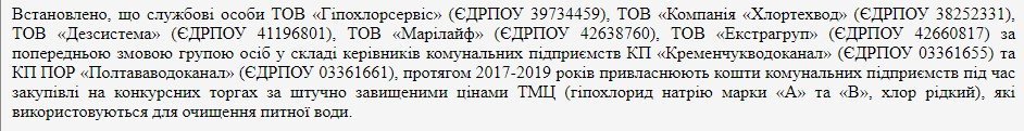 Фігурантом справи є й КП ПОР «Полтававодоканал». В ухвалі суду йдеться про обставини, які стали опинилися в полі зору слідства: низка пов’язаних підприємств (постачальників «Кременчукводоканалу» та «Полтававодоканалу») – ТОВ «Гіпохлорсервіс», ТОВ «Компанія «Хлортехвод», ТОВ «Дезсистема», ТОВ «Марілайф», ТОВ «Екстрагруп» за попередною змовою з посадовими особами водоканалів привласнювали кошти КП протягом 2017-2019 років, завищуючи ціни на хлор. (Усі постачальники не є виробниками хлору.)