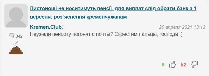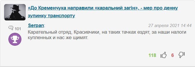 Найбільше «не зайшли» читачам коментарі Kremen.Club. Його коментарям також присвоєний відповідний значок. За квітень він написав 39 коментарів і зібрав ними аж 300 дизлайків. Ось коментар, який не сподобався іншим найбільше: