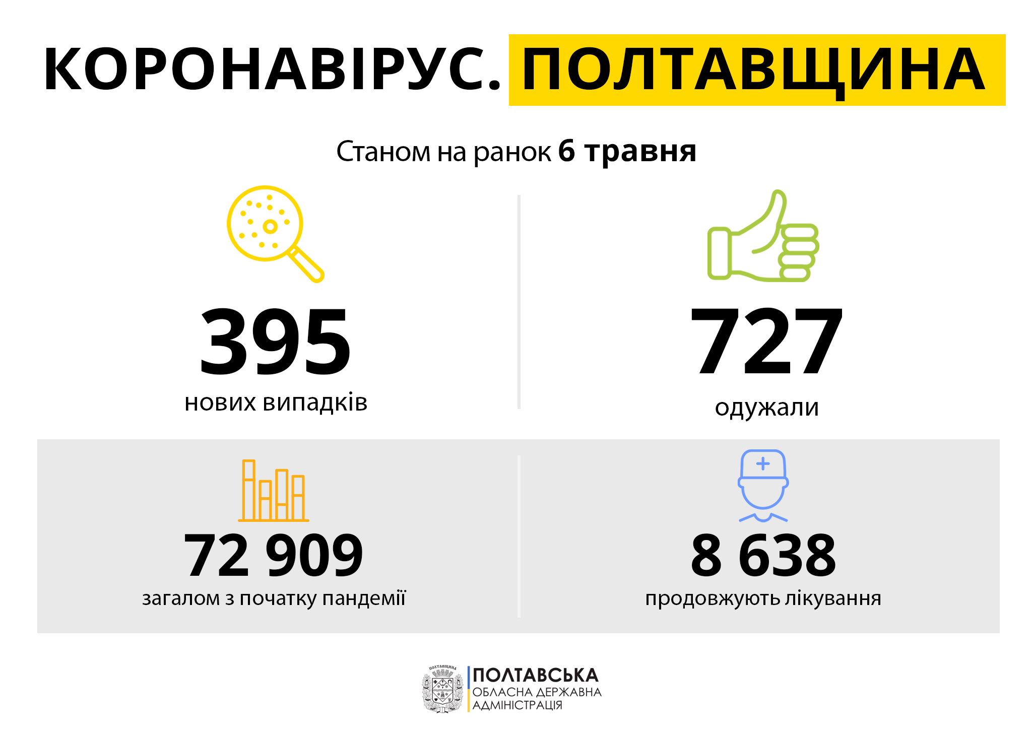 За інформацією Полтавського обласного лабораторного центру МОЗ України, від початку карантину на Полтавщині діагностували 72909 випадків захворювання на COVID-19, за минулу добу нових випадків – 395.
