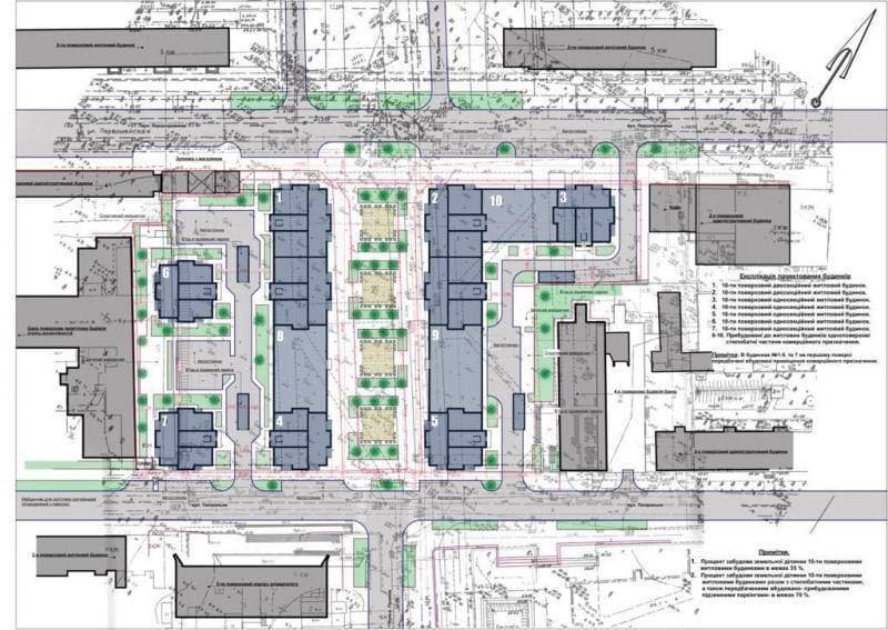 Власне, тут під багатоповерхову забудову планують використати дві ділянки загальною площею 1,96 гектара. Очікується зведення трьох 9-ти поверхових секцій комплексу на 328 квартир. Здається, все гаразд, але… Згідно з Державними будівельними нормами (ДБН), площа прибудинкової території обчислюється залежно від кількості людей, які проживатимуть в будинку. У плані забудови кількість майбутніх мешканців комплексу суттєво занижена. Так, очікувана кількість мешканців становить 328 осіб – тобто, по одній людині на кожну квартиру.
