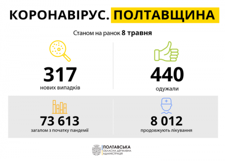 За інформацією Полтавського обласного лабораторного центру МОЗ України, від початку карантину на Полтавщині діагностували 73613 випадків захворювання на COVID-19, за минулу добу нових випадків – 317.