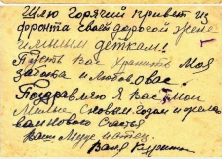Здравствуй, папа! Шлю тебе свой любимый горячий привет, обнимаю и целую крепко, привет от мамы и Гали. Мы живем хорошо, но сильно скучаем по тебе. До свидания, обнимаю и целую крепко. Будь счастлив и здоров, дорогой папа. Бей врага и возвращайся с победой домой. Твой сын.