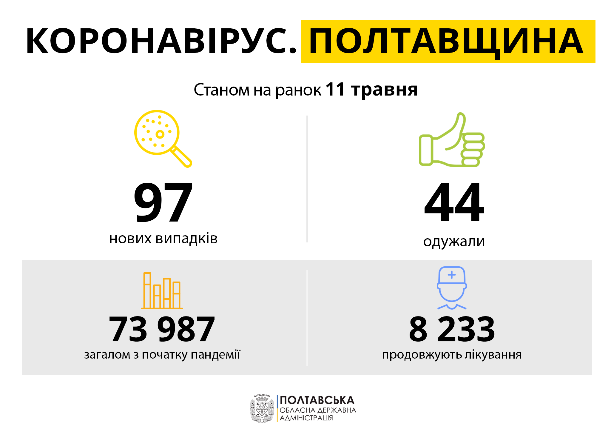 За інформацією Полтавського обласного лабораторного центру МОЗ України, від початку карантину на Полтавщині діагностували 73987 випадків захворювання на COVID-19, за минулу добу нових випадків – 97.