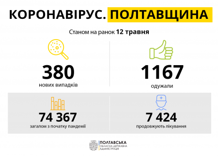 За інформацією Полтавського обласного лабораторного центру МОЗ України, від початку карантину на Полтавщині діагностували 74367 випадків захворювання на COVID-19, за минулу добу нових випадків – 380.