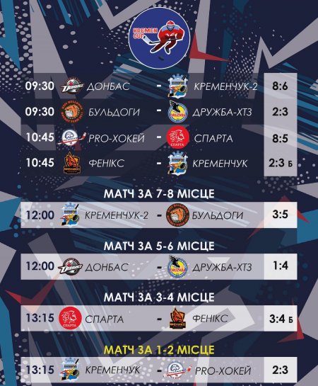 Дві кременчуцькі команди були представлені у двох групах. У боротьбі за 7-8 місце «Kременчук-2» поступився «Бульдогам» з рахунком - 3:5. А ось інша кременчуцька команда вийшла до фіналу. На льоду «Kременчук» зійшовся з «PRO-хокей», але нашим хлопцям трохи не вистачило, щоб перемогти суперника. У підсумку «PRO-хокей» - став переможцем турніру, а «Кременчук» - завоював «срібні» нагороди.