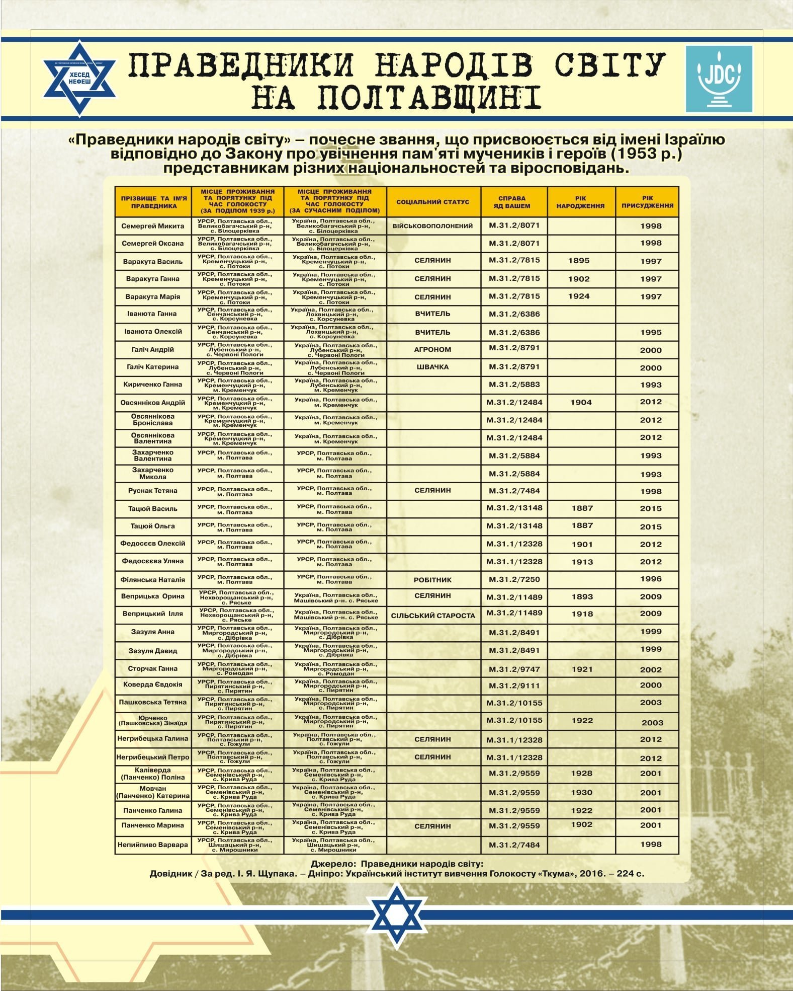 Станом на 1 січня 2020 року звання Праведників народів світу мають 2 659 громадян України, серед них 36 людей – жителі Полтавщини. Про це повідомила благодійна організація «Полтавський єврейський фонд «Хесед Нефеш» 14 травня.
