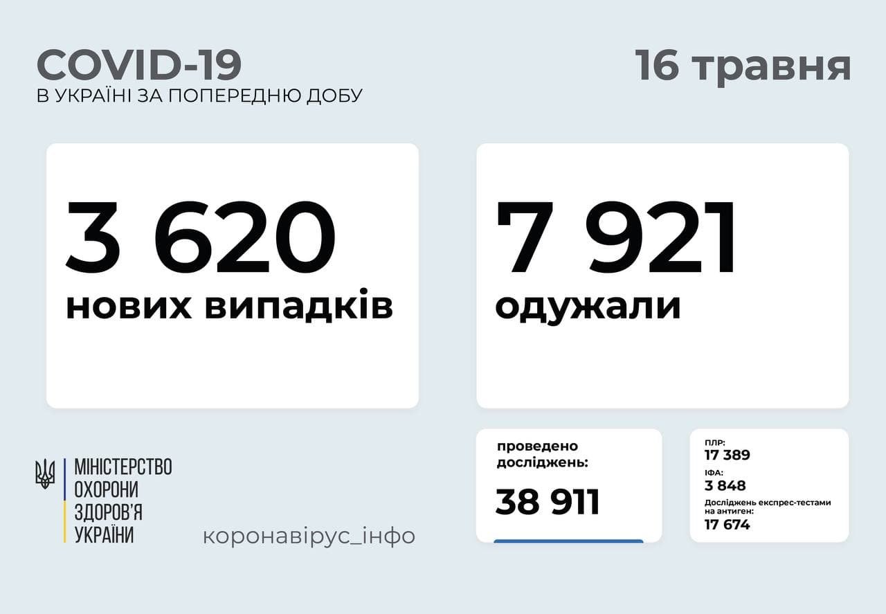 3 620 нових випадків коронавірусної хвороби COVID-19 зафіксовано в Україні станом на 16 травня 2021 року. Зокрема, захворіли 172 дитини та 60 медпрацівників.