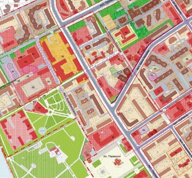 А вже на проєктному плані, громадські обговорення по якому завершилися 13 травня, стадіону або спортивного майданчику немає взагалі. Замість нього можна побачити вже існуючу багатоповерхівку, що має адресу вул. Софіївська, 26.