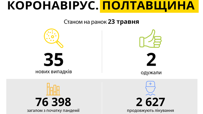 За весь час пандемії на Полтавщині COVID-19 виявили у 76398 людей, з яких 72020 одужали, а 2627 продовжують лікування. Зареєстровано 1751 летальний випадок.