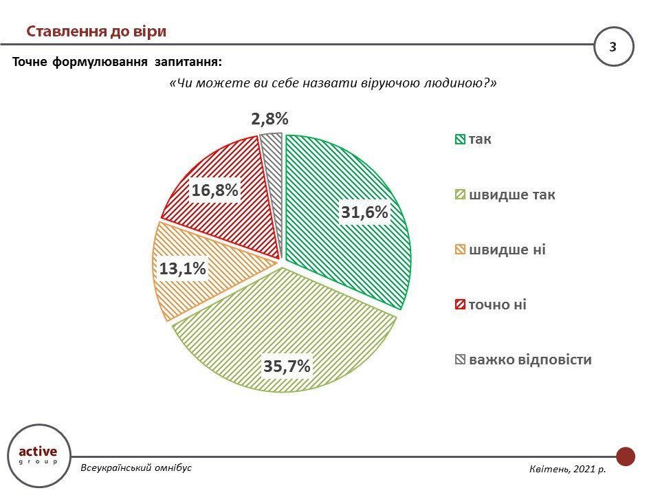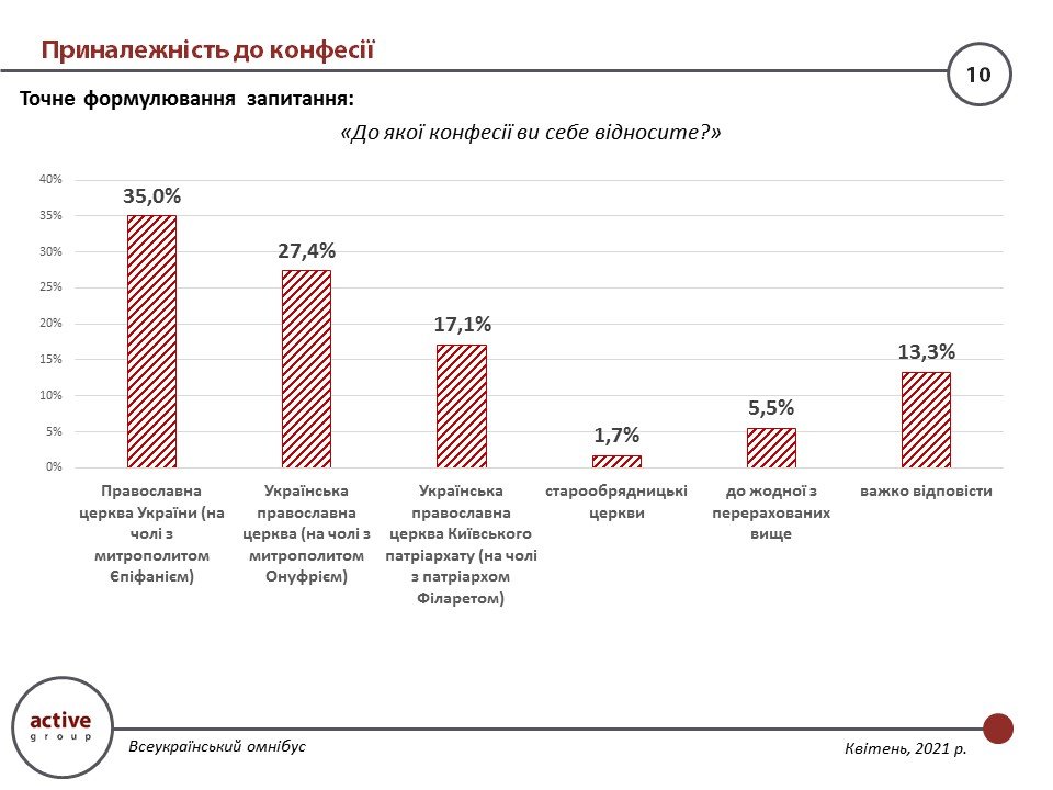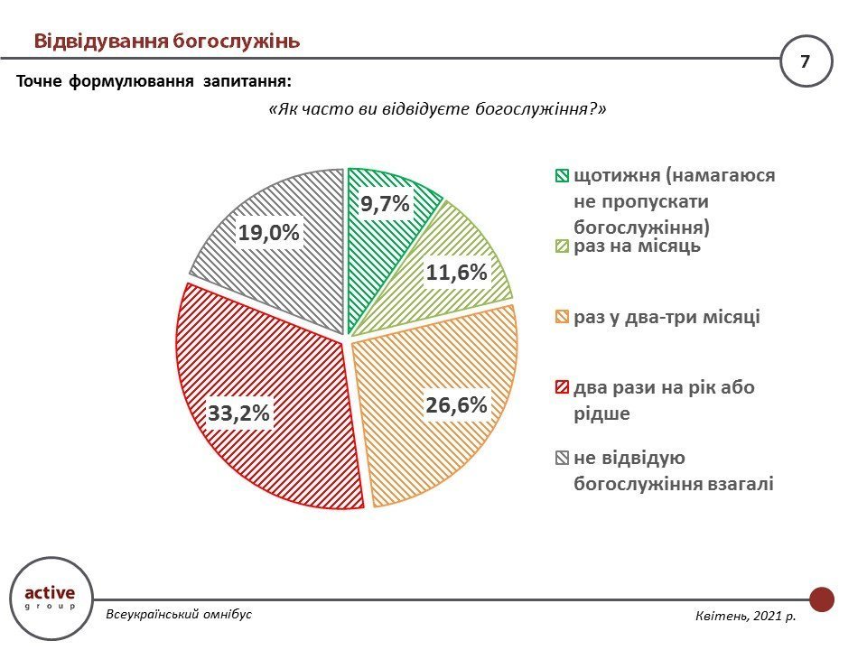У квітні 2021 року компанія «Active Group» провела дослідження «Всеукраїнський омнібус», метою якого було з’ясувати ставлення громадян країни до релігії. В дослідженні взяли участь 1200 українців, що мешкають в різних регіонах (за виключенням окупованих територій).